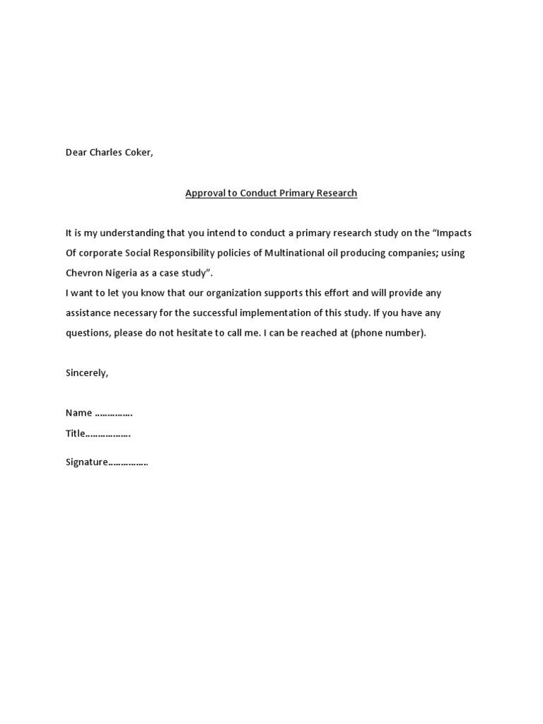 .about conducting research responsibly to specific regulations governing a type of research (e.g. Sample approval letter to conduct research essay letter to conduct research. Thank you in advance for your interest and assistance with this research. Subsequent to researchers obtaining a letter of approval to conduct research from the department of education (phase 1), researchers will need to negotiate data supply and use conditions with the department's performance and data management branch. 26.02.2018 · request letter to conduct research study is a required preliminary formality in conducting a 25.12.2019 · an approval letter grants authority to an individual, organization, or body to the letter also deals with the details of the research program in order to help the company.